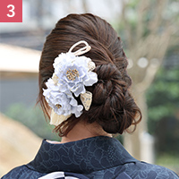 - 髪を上下二つに分け、毛束を使って後ろに大きくボリュームが出るようにまとめる。
